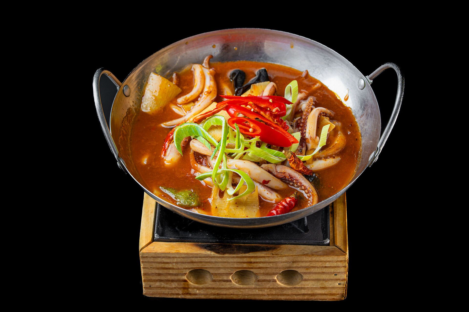Calamari piccanti in padella di fuoco