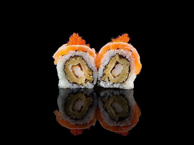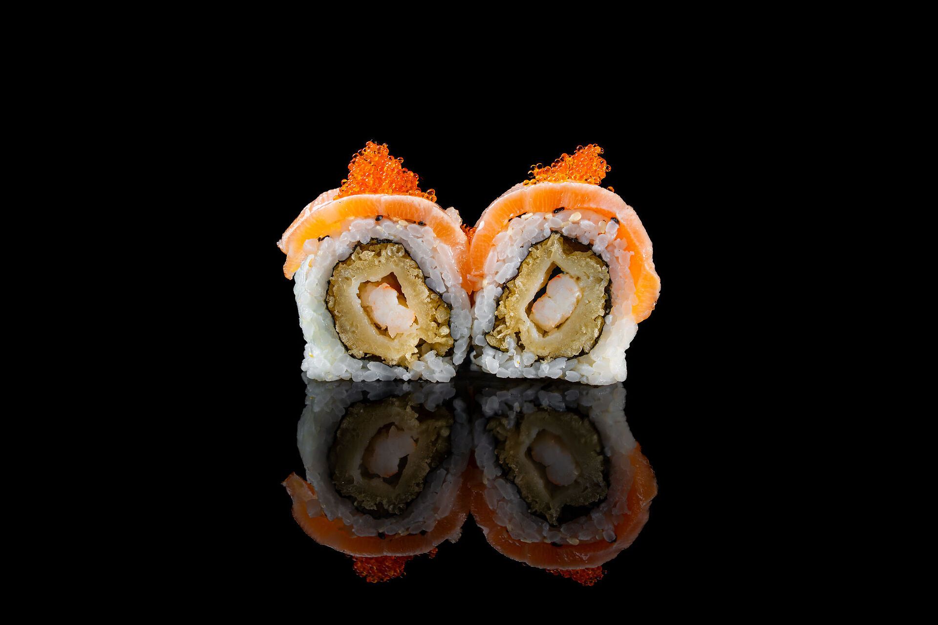 Gamberi in tempura, salmone scottato, tobiko e salsa Teriyaki