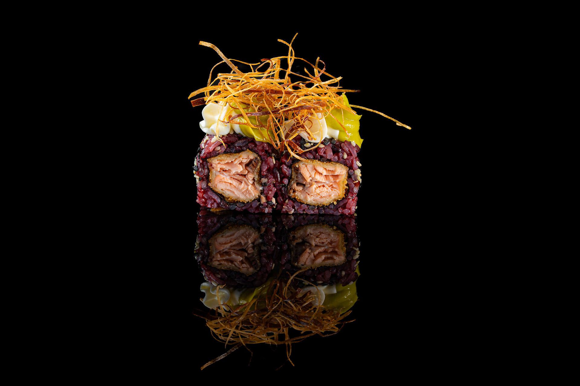 Salmone fritto, philadelphia, salsa avocado, porri fritti